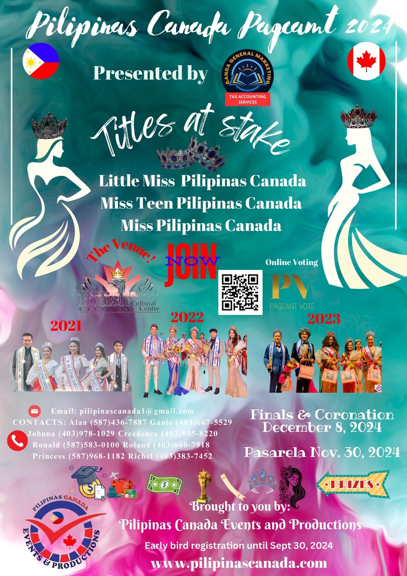 THE Miss Philippines-Alberta & The Prairies and Mister Pilipinas Worldwide -Alberta & The Prairies screening and presentation happening on October 27, 2024 at DoubleTree by Hilton Calgary North, 1pm