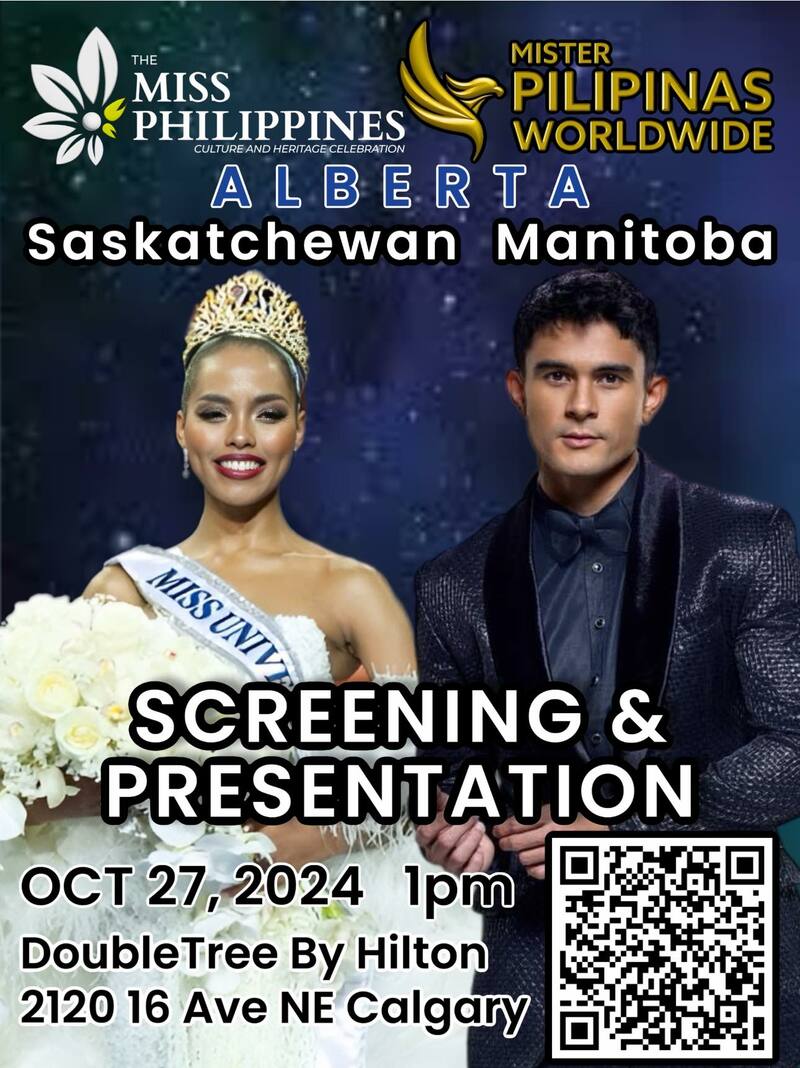 THE Miss Philippines-Alberta & The Prairies and Mister Pilipinas Worldwide -Alberta & The Prairies screening and presentation happening on October 27, 2024 at DoubleTree by Hilton Calgary North, 1pm